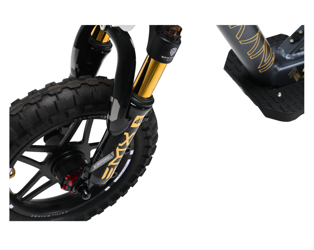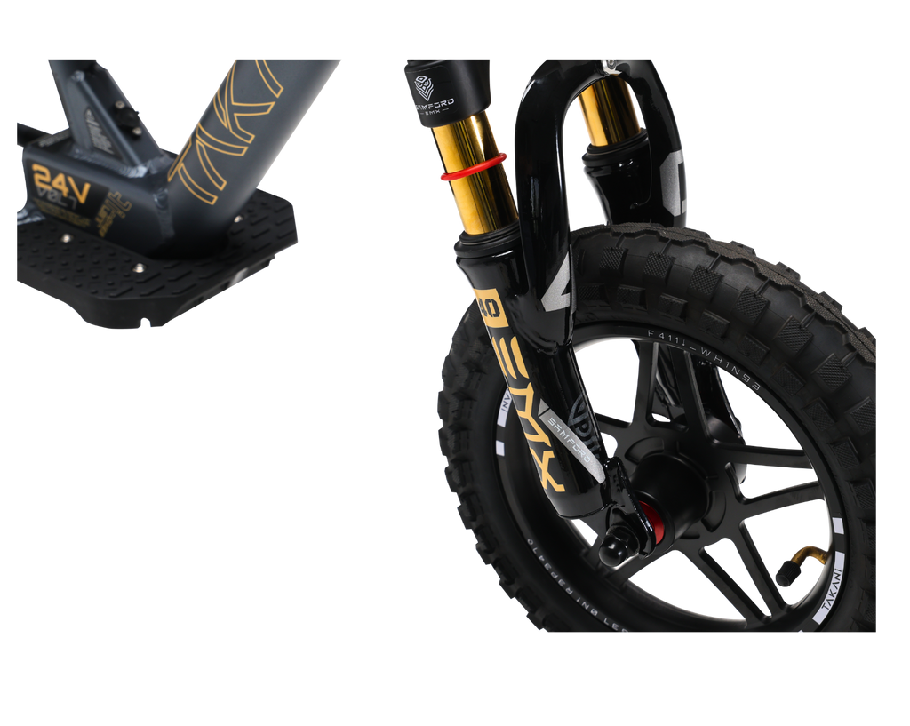 TAKANI products are built with durability and performance in mind. This balance bike features a state of the art, brushless 'high speed' and 'high torque' hub motor with little moving parts that can break. Focussed on safety, we have fully integrated the juicy 24V lithium battery into the frame (quick swappable in the -RS version). This is to protect from the elements, bumps, dirt and to optimise the bike's centre of gravity.