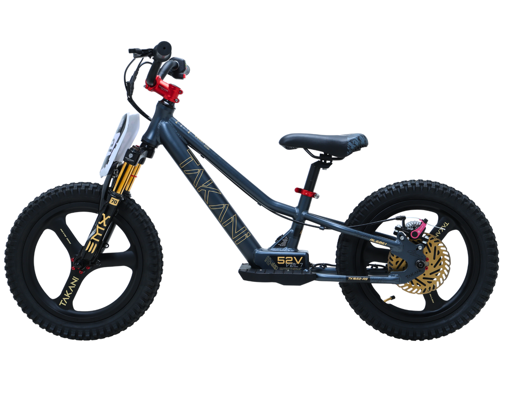 Adjust it to the speed setting you like. Let the rider gain confidence according to their skill level. TAKANI products are built with durability and performance in mind. The balance bike features a state of the art, brushless 'high speed' and 'high torque' hub motor with little moving parts that can break. Focused on safety, we have fully integrated the juicy 52V lithium battery into the frame. This is to protect from the elements, bumps, dirt and to optimise the bike's centre of gravity.